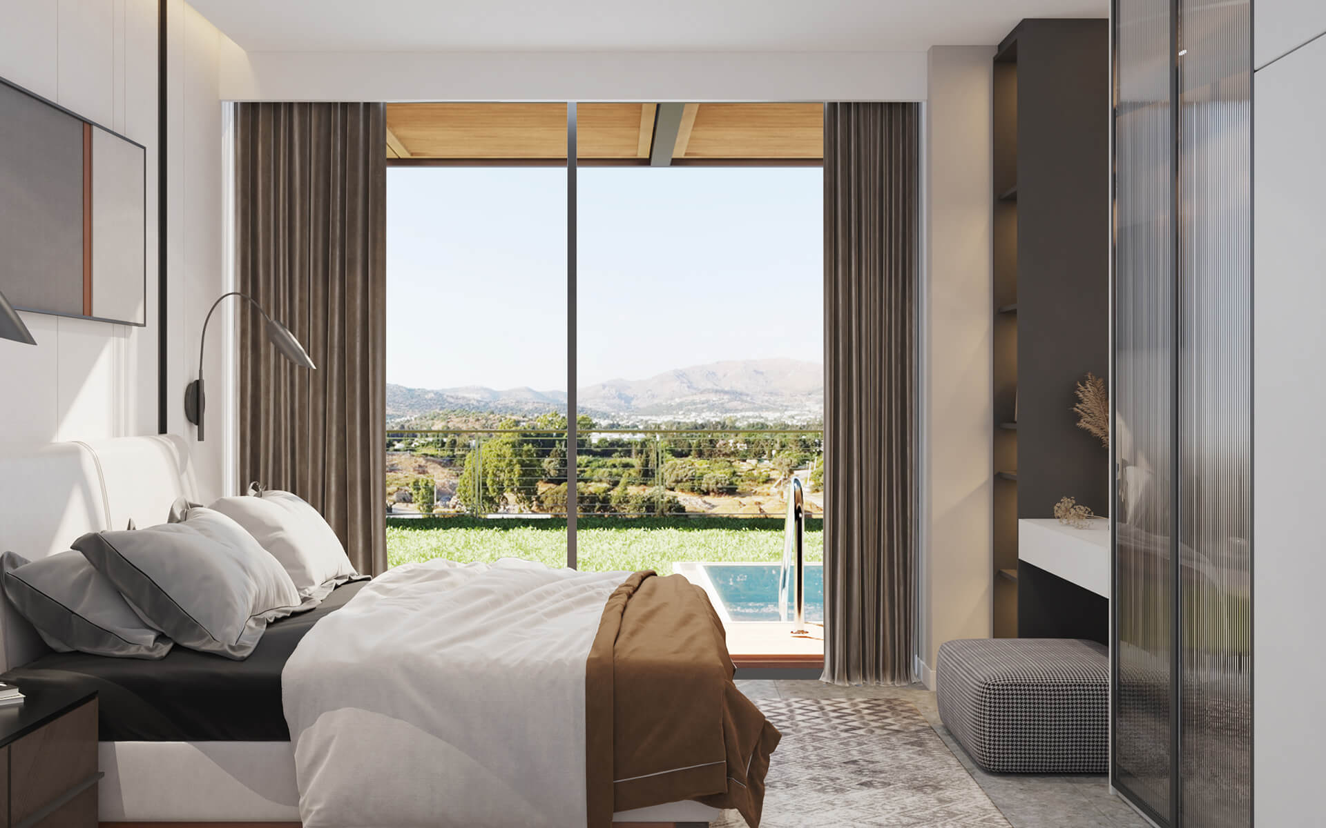 Sade ve modern tasarımıyla ferah ve aydınlık odalar, sizin için özenle düşünülmüş ergonomik iç mekan alanları, Gümüşlük’ün benzersiz güzellikleri ve renkleriyle, huzurun tam ortasında bir deneyim, ARC de LUNE...